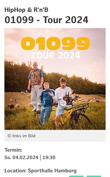 Verkaufe hier mein Ticket für das 01099 Konzert am Sonntag, 04.02.24.
