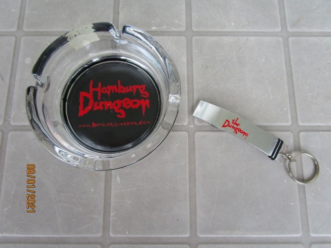 die Sachen wurden nach einem Besuch im Hamburg Dungeon gekauft und standen dann nur in der Vitrine. 1 Schlüsselanhänger mit Flaschenöffner und 1 Aschenbecher. Ideal als Beigabe, wenn man Karten oder Gutscheine für das Hamburg Dungeon verschenken möchte. Versand ist möglich.
