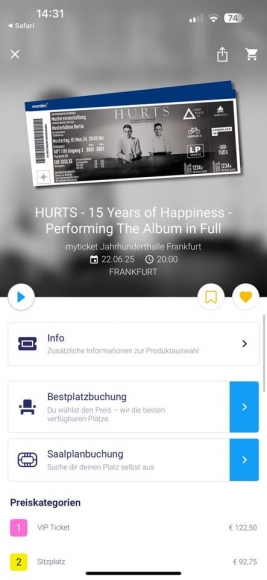1-2 Tickets Hurts Konzert Frankfurt 22.06. - Preis pro Karte