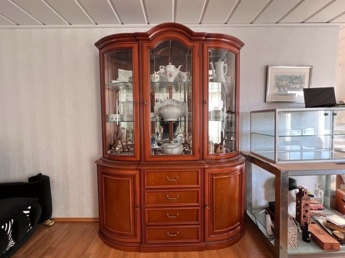 Der Gesamtzustand und optische Eindruck ist neuwertig, da nur an Fest- und Feiertagen benutzt. Auch die Polster sind fleckenfrei und ohne Abnutzungsspuren. Nur das Sideboard hat kleinere Macken und leichte Kratzer auf der Oberfläche, die sich rauspolieren lassen.