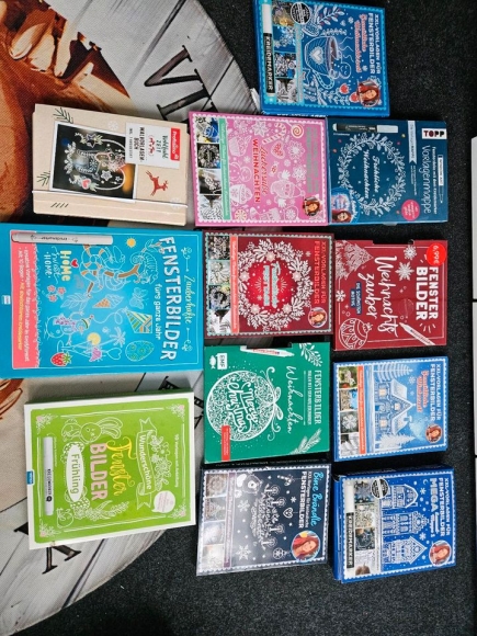 Ich verkaufe hier mehrere Malvorlagen für Fenster/Spiegel. Pro Vorlagenbox hätte ich gern 3,- . Für alle Zusammen 25,00 Euro. Wer möchte darf gern auch noch Stifte dazu gratis mitnehmen. Es sind noch alle vollzählig.
