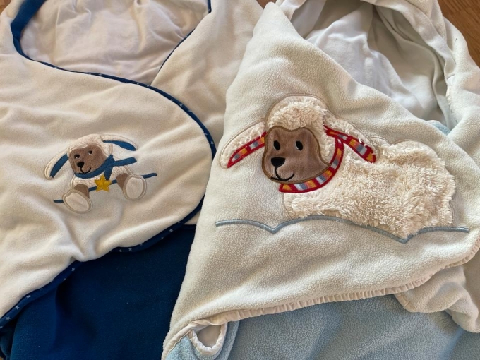 Zu verkaufen sind zwei sehr gut erhaltene Einschlagdecken der Firma Sterntaler. Sie sind weich und kuschelig und eignen sich unter anderem gut für die Auto-Babyschalen. Sie haben normale und leichteGebrauchsspuren. Wir konnten keine Beschädigungen feststellen.