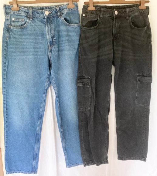 1x Jeans, blau, 1 x Cargohose, schwarz, jeweils mit Reißverschluss und verstellbarem Bund.