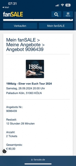 Verkaufe hier 2 Karten für das 1986zig Konzert. Entweder die letzten 12 Stunden die das Angebot auf fansale laufen kann dort kaufen oder hier per Kleinanzeigen.
