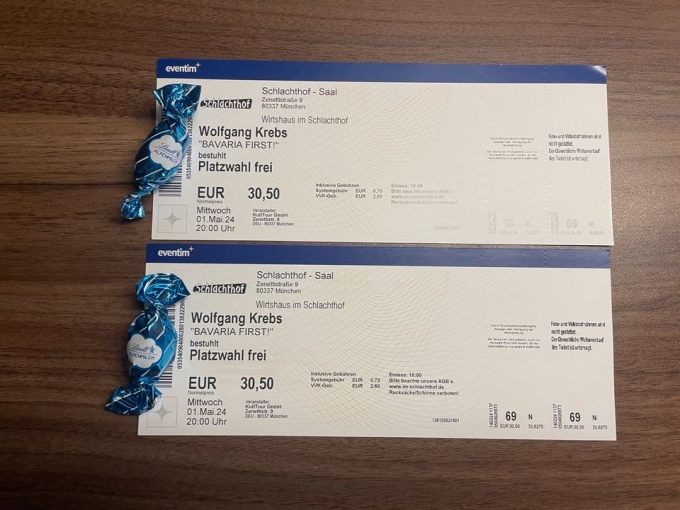 Verkaufe zwei Karten für Wolfgang Krebs „Bavaria First“ am 1. Mai 2024 um 20 Uhr in München.