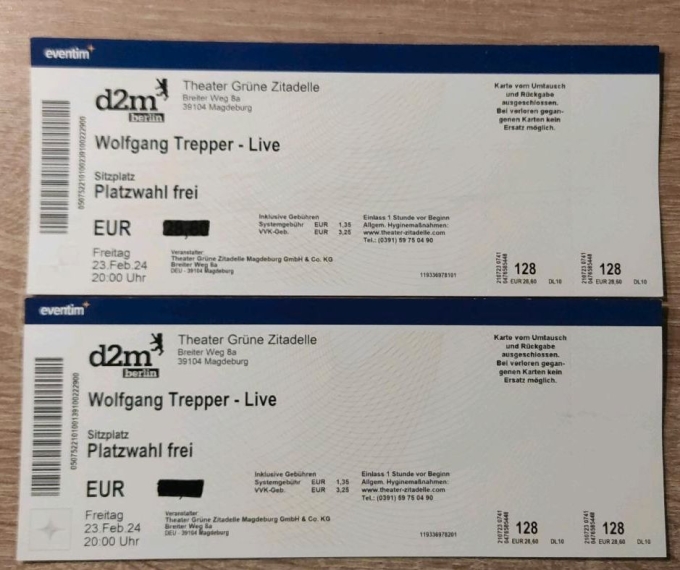 Biete 2 Tickets für Wolfgang Trepper in Magdeburg im Theater Grüne Zitadelle am 23.02.2024 um 20.00 Uhr. Originalpreis je Ticket 28,60€, beide zusammen für 35€ zu verkaufen. Nur Abholung aus Möckern.