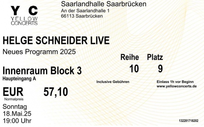 Ich habe 2 Tickets abzugeben für Helge Schneider am 18.05.2025 in Saarbrücken.