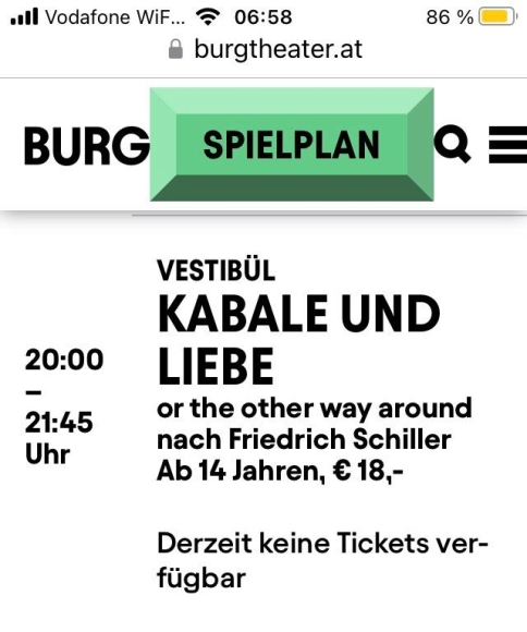 Ich biete 2 Tickets für die ausverkaufte Vorstellung Kabale und Liebe am 19.6.25 im Burgtheater Wien.