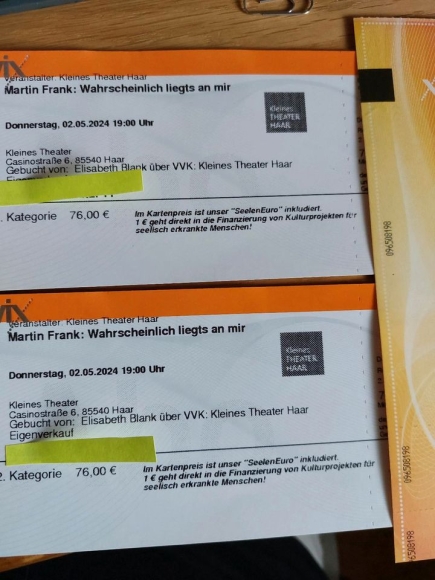 2 Tickets Martin Frank heute 2.5.24, 19 Uhr, Kleines Theater Haar, Beginn 19 Uhr, wegen Krankheit kurzfristig