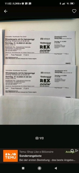 Verkaufe 2 Original Tickets für die Silvesterparty mit DJ Heinzemiggel im REX Bensheim am 31.12.2023.