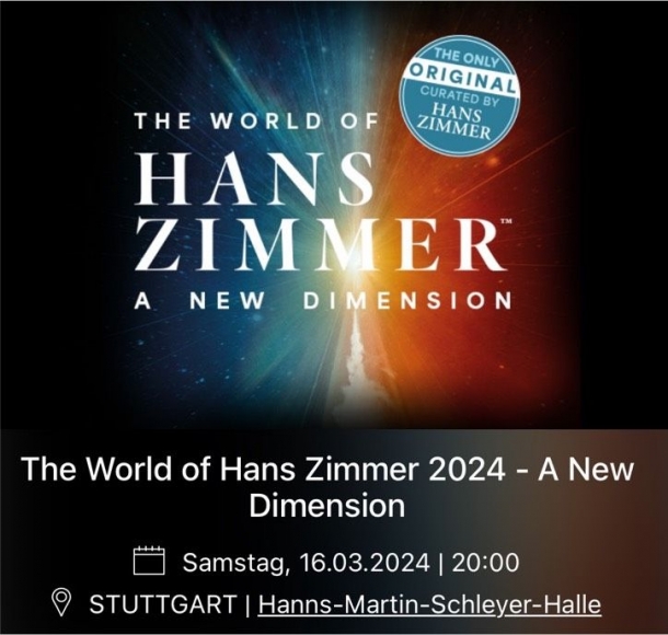 Ich verkaufe 2 Tickets für das The World of Hans Zimmer 2024 - A New Dimension Konzert am 16.03.2024 in der Hans-Martin Schleyer Halle in Stuttgart.