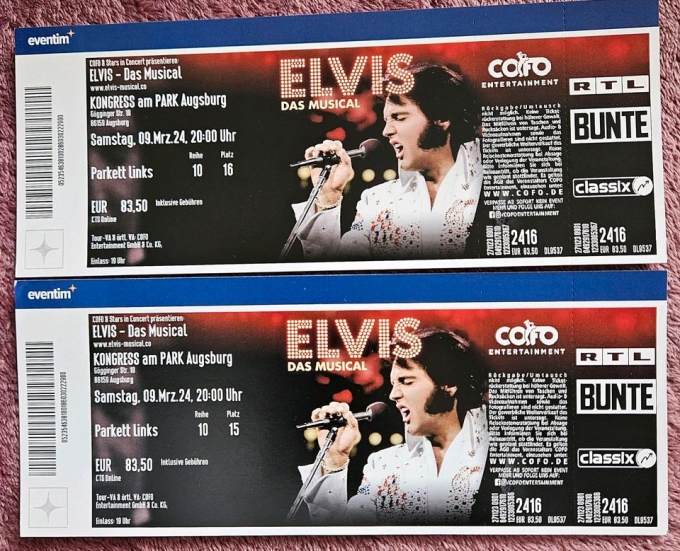 Hallo, ich verkaufe 2 Karten für das ausverkaufte Elvis Musical in Augsburg im Kongress am Park am Samstag, 9. MÄRZ 2024. Parkett links, Reihe 10, Platz 15 und 16, Originalpreis 83,50 Euro pro Karte, da meine Tochter mit Mann leider nicht mitkommen kann. Ich selbst bin aber vor Ort.