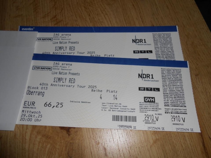 Verkaufe 2 x Simply Red Tickets - 40th Anniversary Tour am 29.10.2025 in Hannover. Die Plätze liegen nebeneinander und befinden sich im Oberrang Block 13.