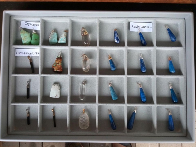 Ich verkaufe die auf den Fotos abgebildeten Schmucksteine. Es sind insgesamt 26 Schmuckstücke unterschiedlicher Form und Gesteinsart (u.a. Bergkristall, Crysopras, Turmalin, Türkis, Lapis Lazuli und weitere Edelsteine). Die Edelstein-Schmuckstücke können als Kettenanhänger (Löcher oder Öse) getragen werden.