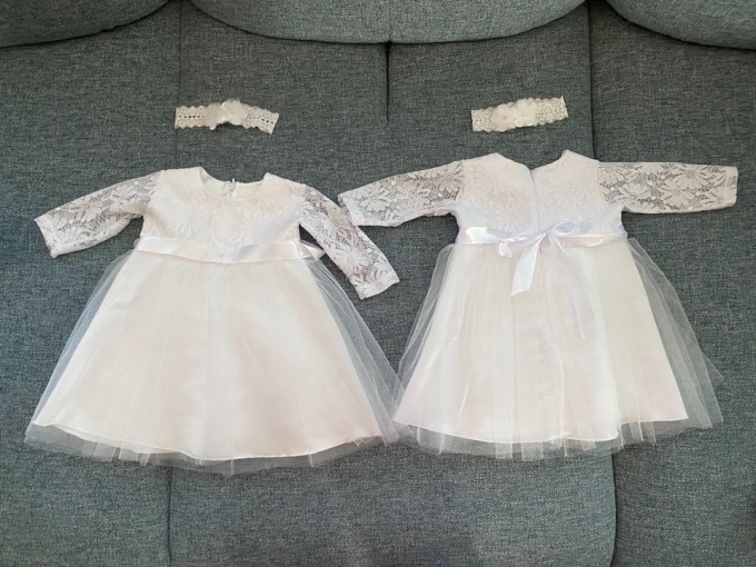 Angeboten werden 2 identische Taufkleider, einmal getragen, ohne Flecken. Auf dem Etikett steht 74, ist aber definitiv kleiner, eher 68. Dazu gibt es jeweils ein Stirnband, siehe Fotos. Neupreis lag bei 45 € pro Kleid.