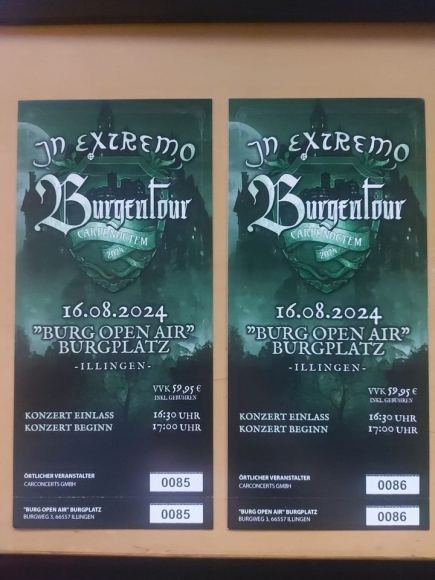 Ich verkaufe zwei Hardcover-Tickets für das IN EXTREMO Konzert am 16.08.2024 in Illingen, Burgplatz im Rahmen der "Burgentour 2024".