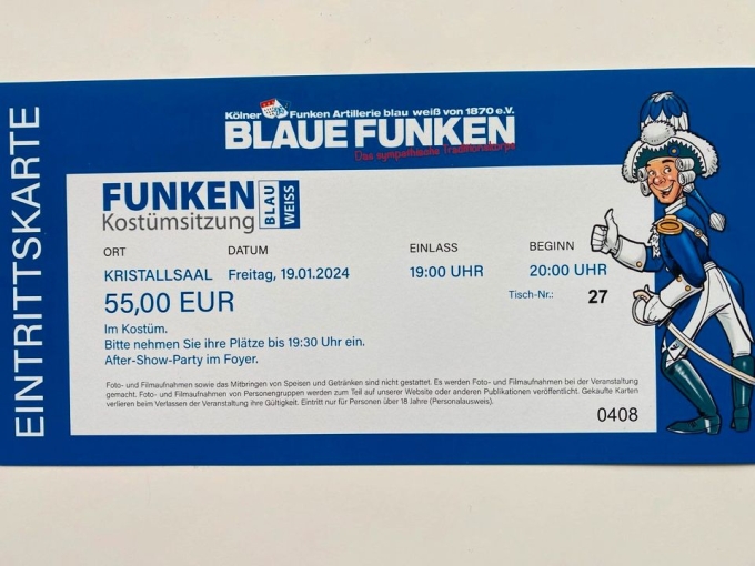 Jede Karte kostet 55,-- €, gute Plätze, Tisch Nr. 27, Einlass ab 19.00 h, man sollte die Plätze um 19.30 h eingenommen haben