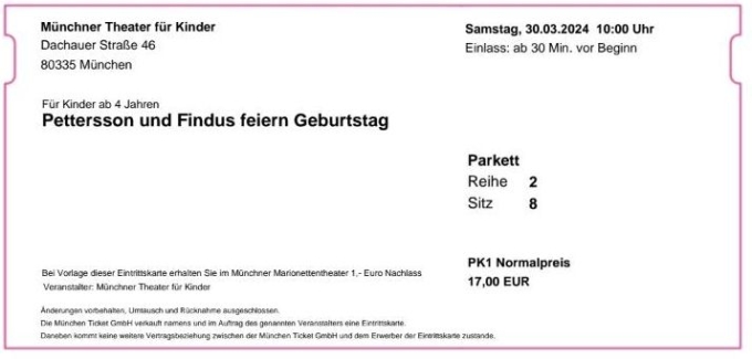Ich verkaufe hier 3 Tickets der Kategorie 1 für das Kindertheater "Pettersson und Findus feiern Geburtstag".