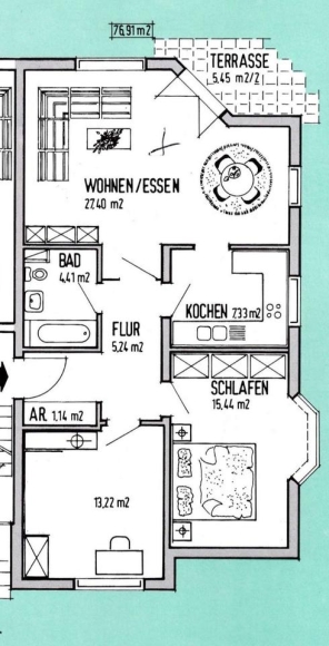 (Schlafzimmer, Arbeitszimmer, Wohnzimmer, Küche, Badezimmer mit Dusche)