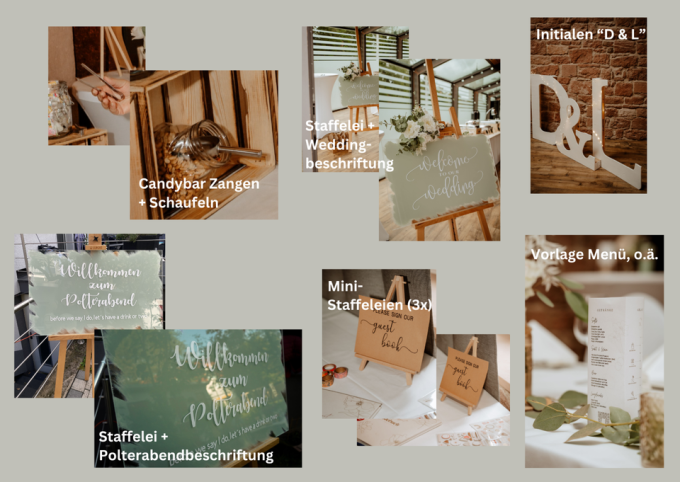 Wir bieten drei Mini-Holzstaffeleien (ggf. mit Schildern, siehe Bild o.ä. wie Candybar, Fotobox, Sitzplan etc.) zum Verleih an.