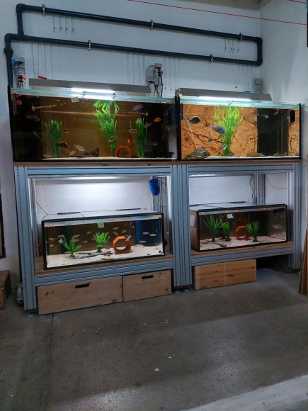 Jeweils ein Aquarium oben, ein Aquarium unten und ein Aluminiumgestell bilden einen separaten Block.