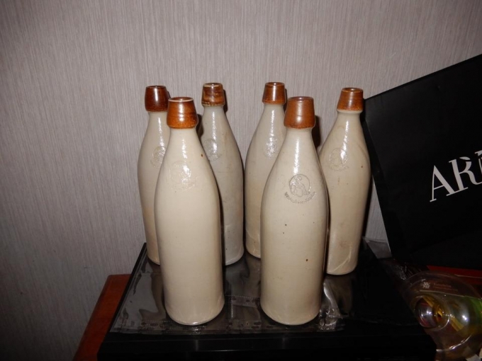 6 alte Steinzeug Tonflaschen Weissbier Kruke, Bierflasche