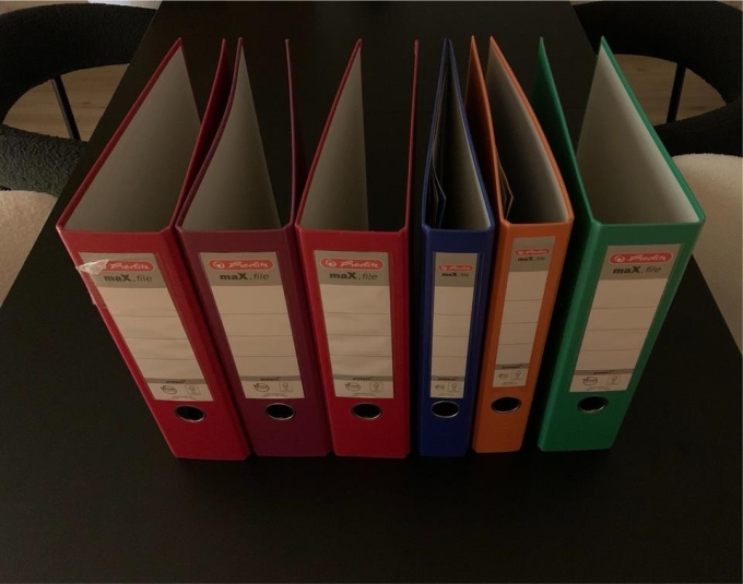 Zu verschenken sind 4 dicke DinA4-Ordner sowie zwei mit dünnem Rücken. Die dünnen Ordner sind außerdem schon mit Verzeichnis ausgestattet (bei Bedarf kann ich die anderen noch nachrüsten - ich habe etliche davon zuhause rumliegen)