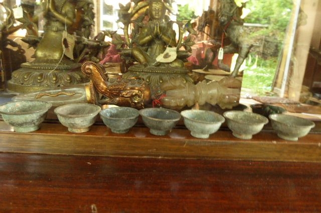 7 sehr alte tibetische Wasseropferschälchen (Dintsar). Wurden für die tägliche Achtsamkeitsübung Yonchap (Wasseropfer) vor der Buddhastatue benutzt.