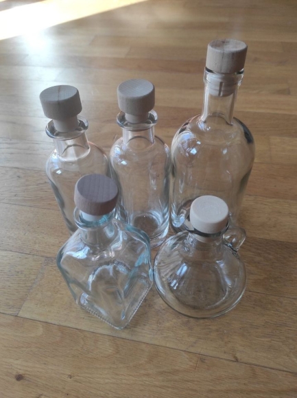 Verkaufe acht Glasflaschen für selbstgemachten Likör, Sirup oder ähnliches in verschiedenen Größen, drei Flaschen mit Schraubverschluss & fünf Flaschen mit Korkverschluss. Preis pro Stück: 1,00 €.