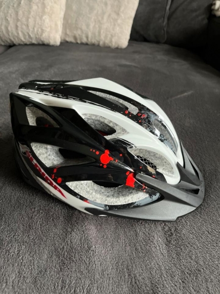 Der Helm ist in schwarz - weiß - rot gehalten und ist in Größe für einen Kopf Umfang von 53 - 57 cm geeignet.