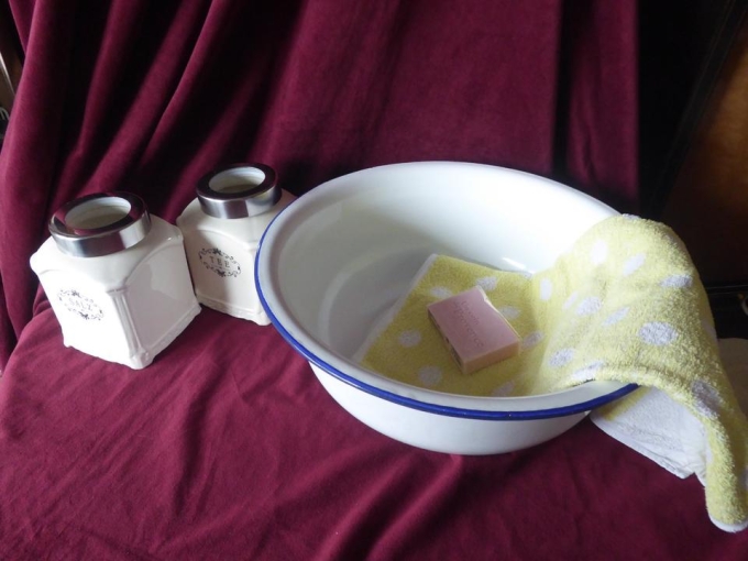 Alte große Emaille Schüssel weiss/blau 2x Vorratsdosen