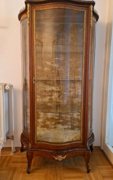 Zum Verkauf steht eine gut erhaltener Vitrinen aus Holz mit aufwendiger Verzierung, Samtstoff und drei Glas Böden.