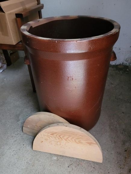 Verkaufe hier ein großes altes Tonfass mit passender Holzabdeckung (wie es früher zum Einlegen / Marinieren und zur Lagerung von Lebensmitteln wie Kraut, Kohl, Fleisch usw. verwendet wurde).