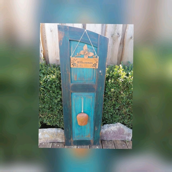 Dekoriert im Rost Style mit Glocke und Willkommensschild.