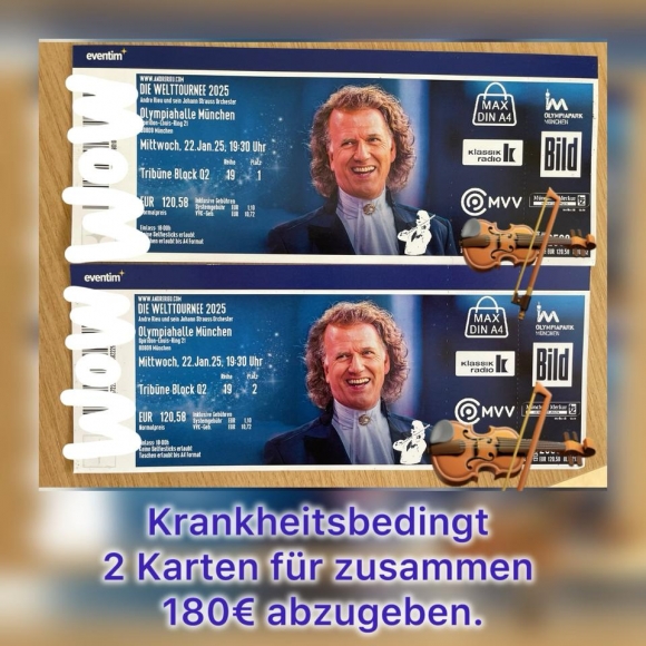 2 Karten für die Welttournee Andre Rieu 22.01.2025 in der Münchner Olympiahalle abzugeben. Sitzplätze Reihe 19!