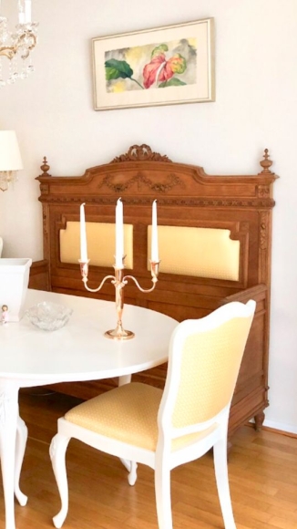Selten schöne antike Bettbank, Flächen mit hellgelben Stoff bezogen, farblich passende Esszimmerstühle und Esstisch in separaten Anzeigen