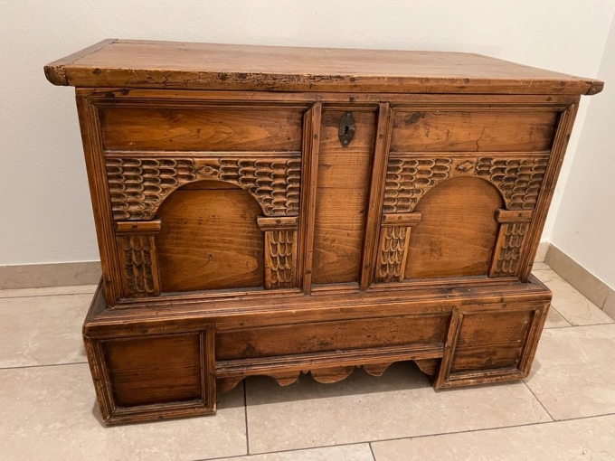 Ich biete eine antike Holztruhe mit Griffen und wunderschönen Verzierungen