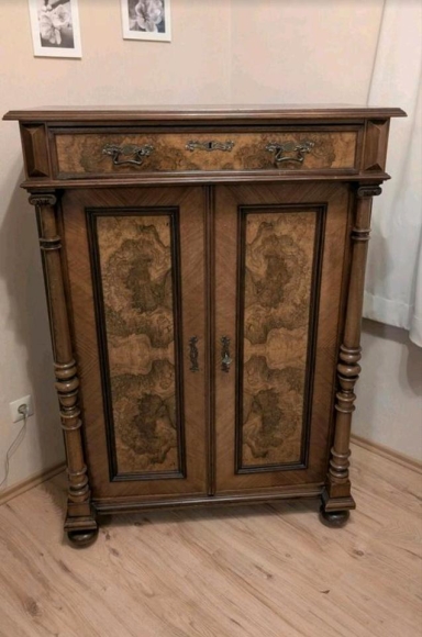 Die Jahre haben dennoch Spuren hinterlassen,wie man auf der Oberseite des Schrankes sehen kann.Kein Holzwurmbefall oder Ähnliches. Er stammt aus einem Nichtraucherhaushalt ohne Tiere.Aus Platzmangel in Liebhaberhände abzugeben. Bei ernsthaften Interessente gäbe es noch ein weiteres Möbelstück aus der selben Epoche (Großes Buffet), das zu einem anderen Angebot dann zu erwerben wäre.