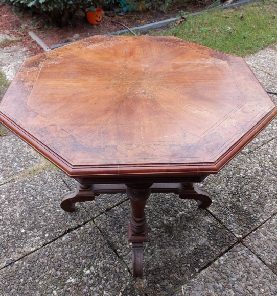 Antiker Tisch aus Holz mit aufwendigen Intarsien und Beinen
