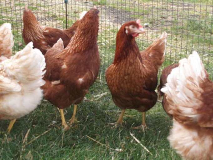 braune Legehennen und Leghorn