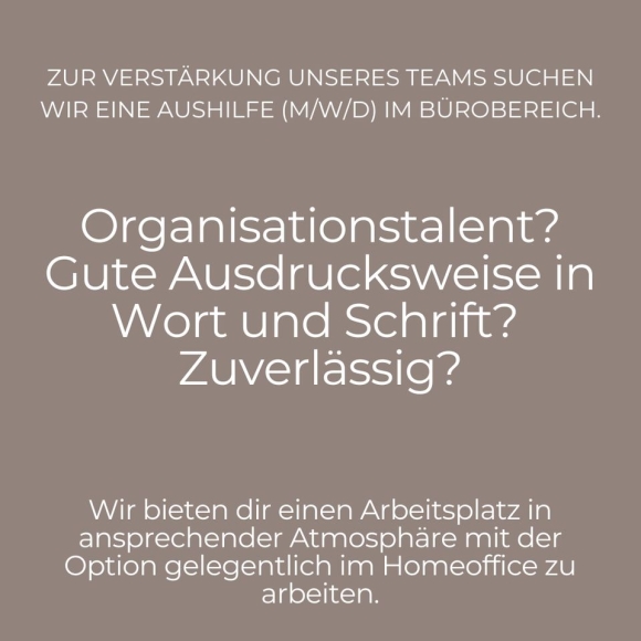 ZUR VERSTÄRKUNG UNSERES TEAMS SUCHEN WIR EINE AUSHILFE (M/W/D) IM BÜROBEREICH.