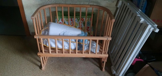 Das Babybay ist von Dezember 2015. Die weiße Erweiterung zum Kinderbett wurde im Oktober 2020 neu gekauft und bis Januar 2023 genutzt. Wenn das Baby zu groß für das Babybay geworden ist, kann man die Erweiterung zusammen mit dem Babybay nutzen und das Baby schläft weiterhin im Bett neben den Eltern. Eine Seite der Erweiterung kann weggelassen werden und später wieder dran montiert werden als alleinstehendes Bett, inklusive Schlupfloch, so dass das Kind alleine herauskrabbeln kann.