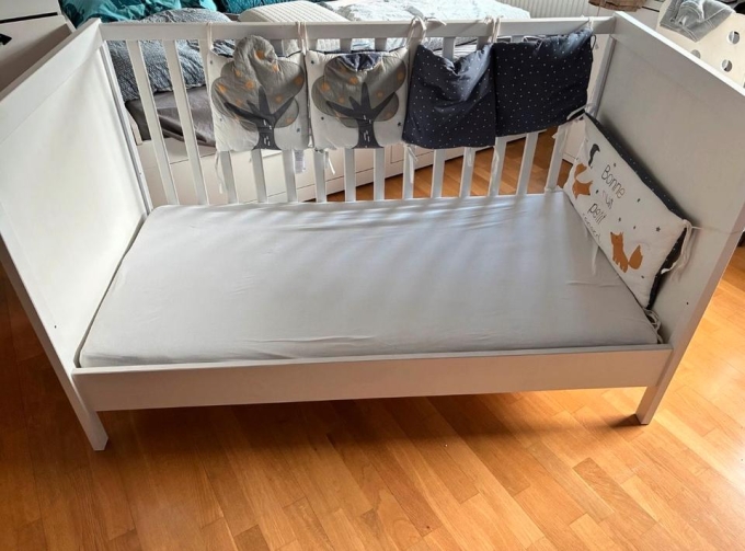 Wir verkaufen unser SUNDVIK Babybett von Ikea in weiß, Größe 70x140 cm. Der Bettboden kann in zwei Höhen montiert werden.