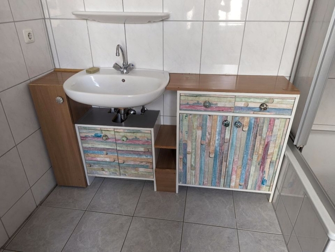 verkaufe hier die gebrauchten Badezimmermöbel meiner Vormieter. Die Möbel wurden per Marke Eigenbau angepasst und haben einige Mängel (siehe Bilder).