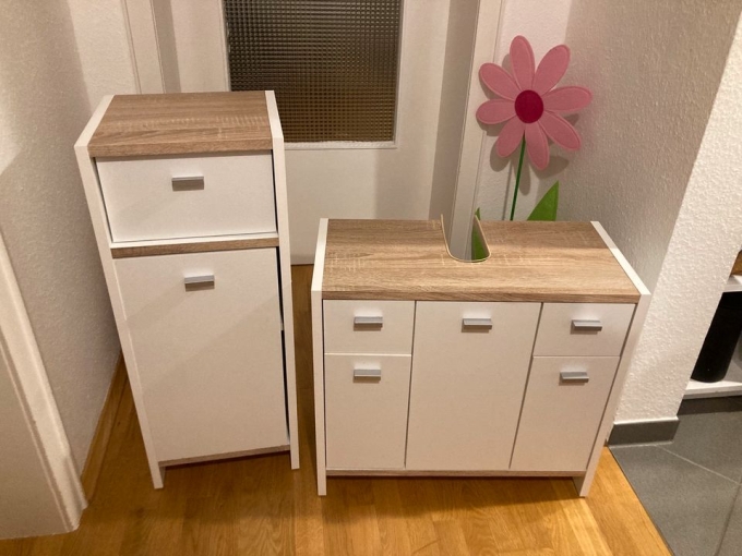 Ich verkaufe ein 3teiliges Bademöbel-Set. Ein Jahr alt, leider an einer Seite etwas aufgequollen. Sonst top.
