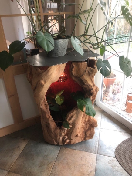 Zu verkaufen ist hier ein ca. 170 Jahre alter Birnbaumstamm, ausgestattet mit einer Abdeckplatte aus Stahl und einer LED Lampe mit Farbwechsel. Das Projekt war sehr viel Arbeit.
