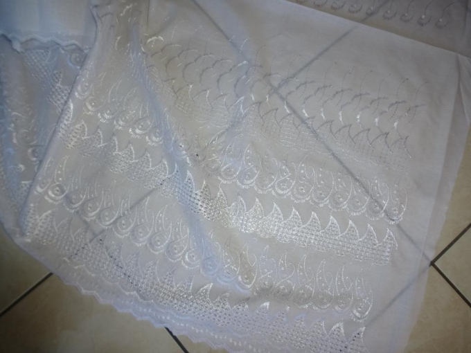 Baumwolle Stoff mit Stickereien und Spitzenbesatz (Lochspitze). Farbe ist Schneeweiß. Der Stoff ist 105cm breit, davon 46cm Breite von Spitzenbesatz. Er kann sowohl für Kleider, als auch für Bettwäsche, Babywäsche, Gardinen und vieles mehr verwendet werden. Ich verfüge über 7 Meter von dem Stoff. Neupreis lag bei 9€ pro Meter. Ich gebe den Stoff für 6€ pro Meter ab. Er kann natürlich verschickt werden.