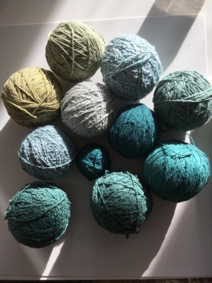 Baumwollgarn unregelmäßig gesponnen, zum Stricken, in verschiedenen Farben ins. 981 g + 3 Knäuel dickere Wolle
