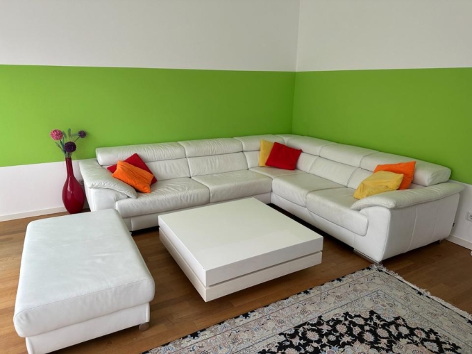 - Hochwertiger Eck-Couchgarnitur echt Leder (Fa. Ewald Shillig) in weiß, L Förmig 295 x 250 cm und eine Tiefe von 105cm. Zu Garnitur gehört auch einem Höcker 120(L) x 70(B) x 40 (H) cm.