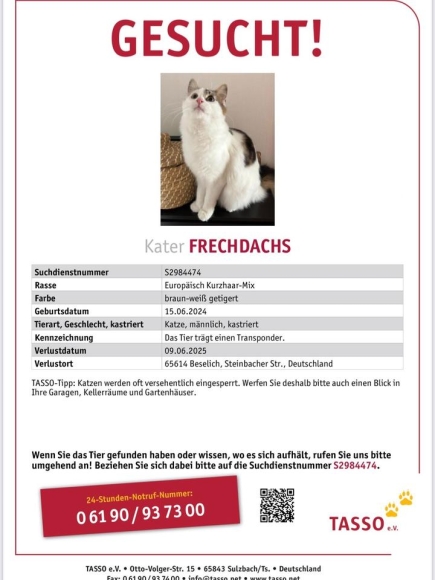 Unser Kater „Frechdachs“ seit 09.06.2025 in Beselich - Obertiefenbach entlaufen